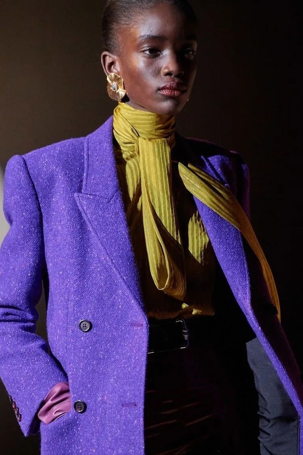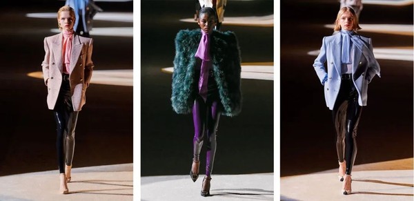 Saint Laurent延续大西装和浪漫绸缎宽带的组合,配合大胆撞色,活脱脱的城市自信时髦女郎。