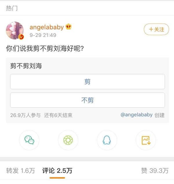 Angelababy最近在微博发起了一项投票,询问粉丝「你们说我剪不剪刘海好呢」,看来女神似乎又想要换刘海发型了!