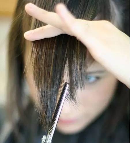 测量好刘海儿的长度,平着剪,把头发扭在一起,剪的时候控制力度。刘海儿的发梢重在自然的零碎感,刘海儿不用过长,控制在眉毛稍往下一点的位置即可。