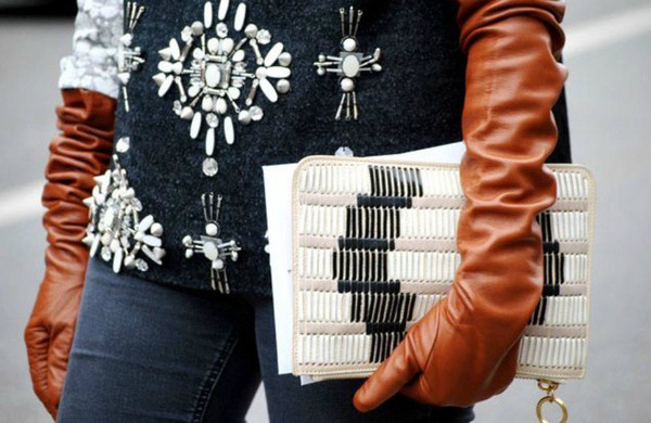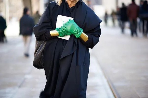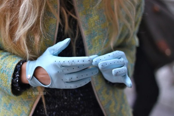 皮手套的颜色在大多数时候可以和包具颜色匹配。当你穿了件西装不那么容易搭配包具,为了使包具颜色不突兀,直接用配色的皮手套中和。整套look 100分!