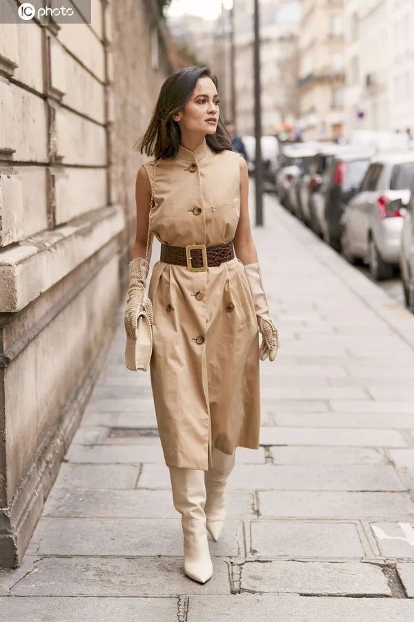 大衣加经典短款黑色皮手套,让整套衣服显得更加高级。