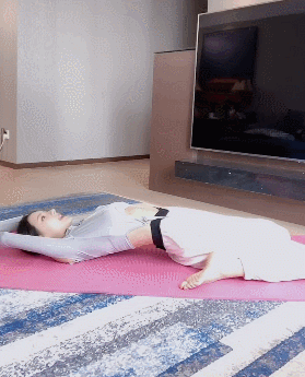 接下来这个动作也比较考验身体的柔韧性了。先以一种“鸭子坐”的方式,两脚分开,让臀部坐到瑜伽垫上,然后手肘后撑,缓缓躺下(第一次尝试一定要慢!不然O姐怕你扭着筋)。这个动作可以燃烧腿部脂肪,起到拉伸大腿的作用。