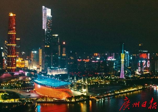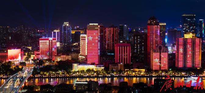 国庆节期间,珠江北岸沿江路一带建筑亮起华灯,国旗国徽点亮珠江夜色。