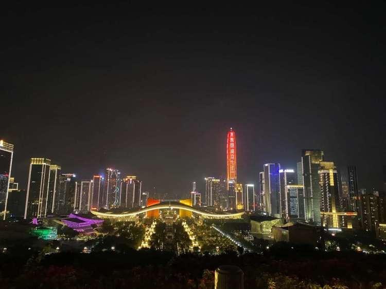 从深圳莲花山公园山顶广场俯瞰深圳CBD,夜景场面非常震撼,第一摩天楼599米的平安国际金融中心直入云霄,这是一座充满活力的城市,夜景璀璨的城市。