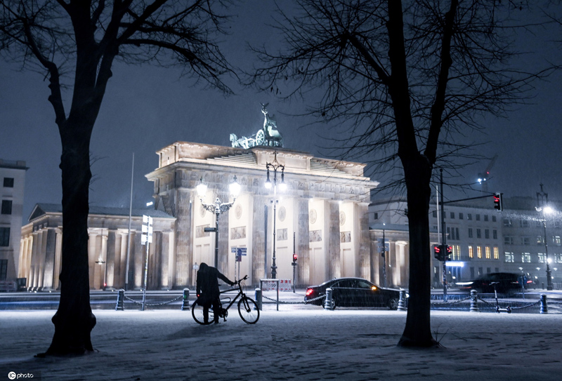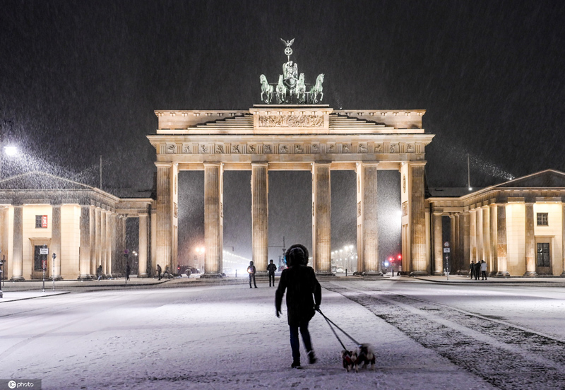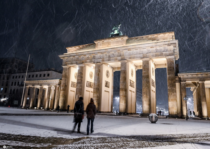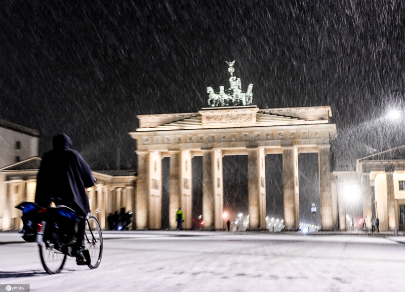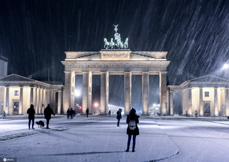 德国柏林大雪纷飞 勃兰登堡门披“白衣”