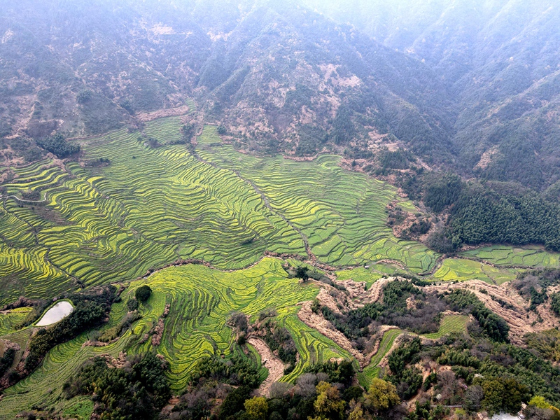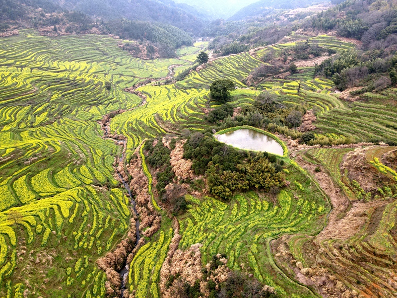 航拍江西婺源篁岭景区油菜花梯田 如诗如画