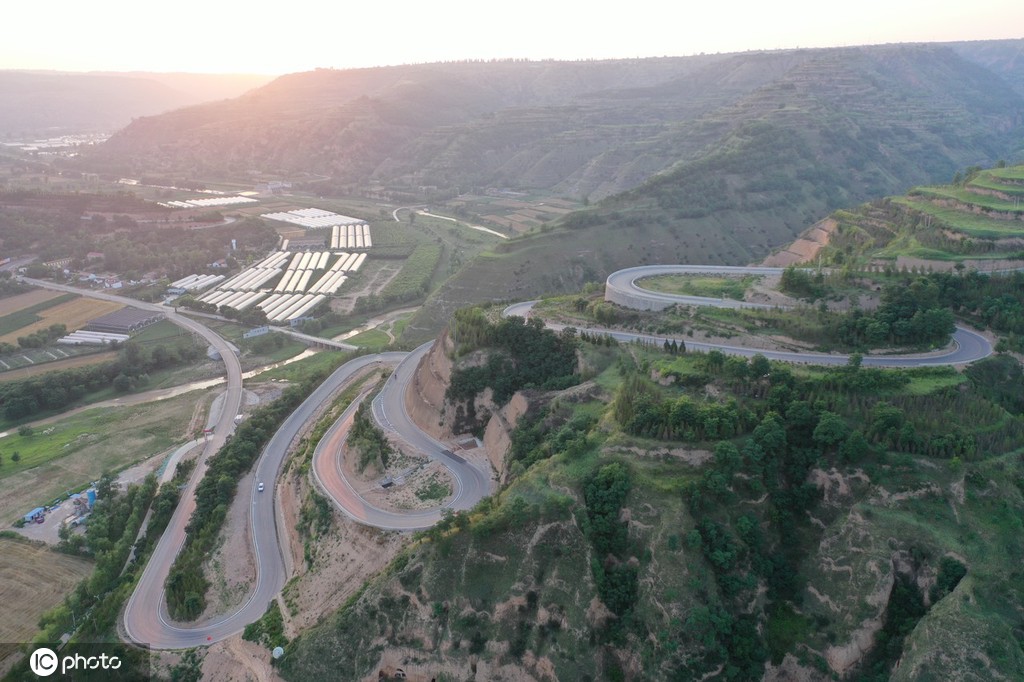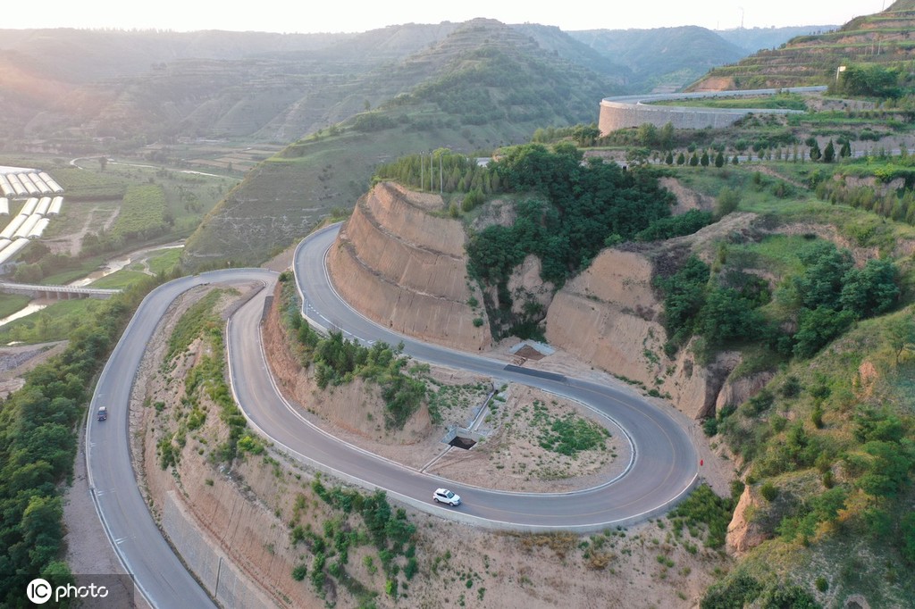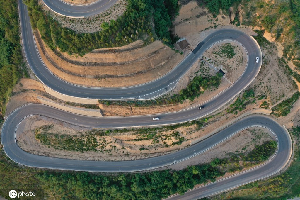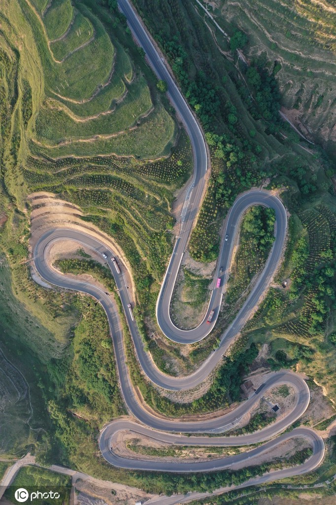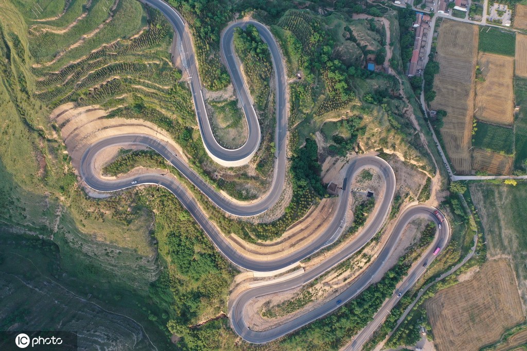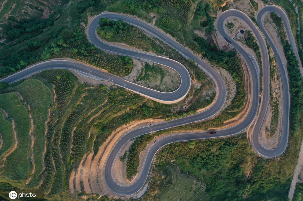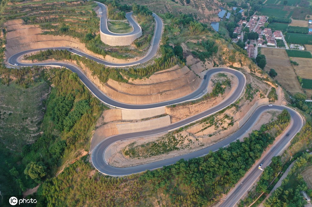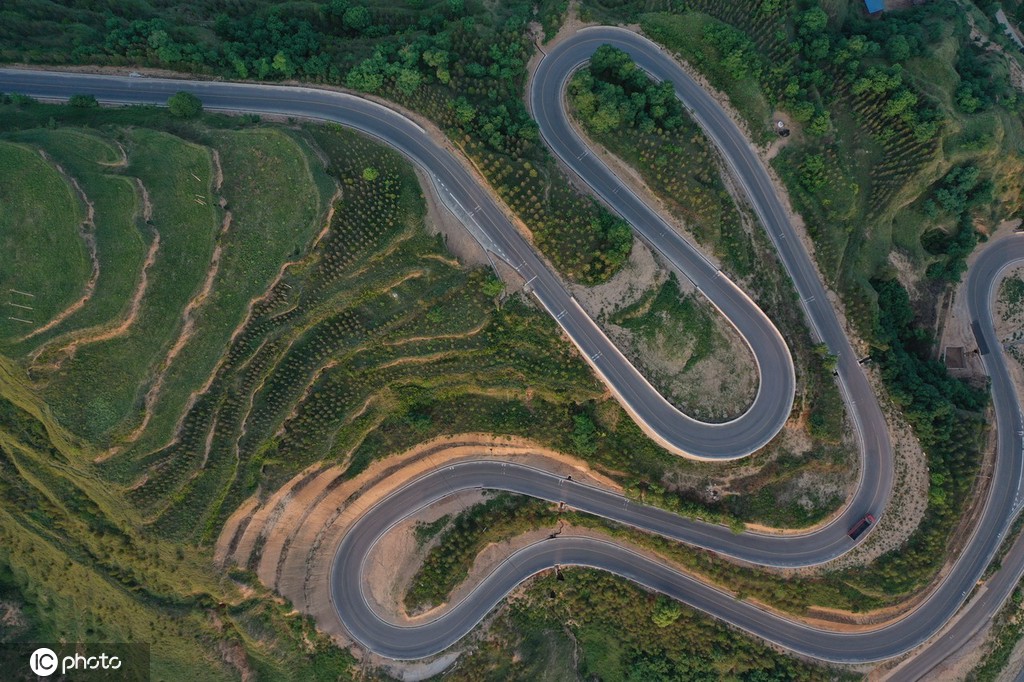 2021年6月25日,在陕西省咸阳市长武县枣园镇境内拍摄的一段山路,道路曲折蜿蜒,道路线条优美灵动。