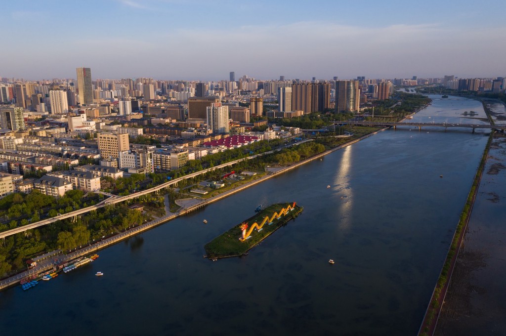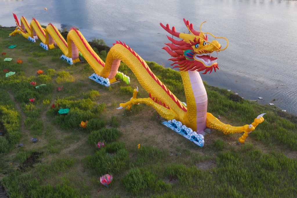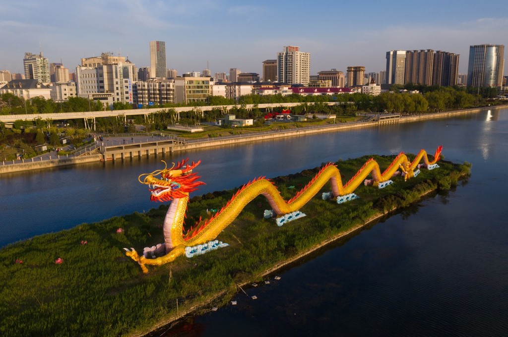2022年4月30日,山西太原汾河景区,经过重新装饰的“巨龙”崭新亮相。这条名为“中华第一巨龙”的景观灯组长126米,龙头高16米,是汾河景区的著名景观。(无人机拍摄) 中新社记者 武俊杰 摄