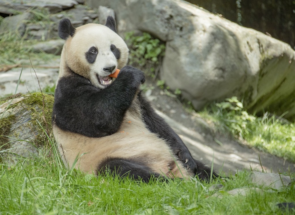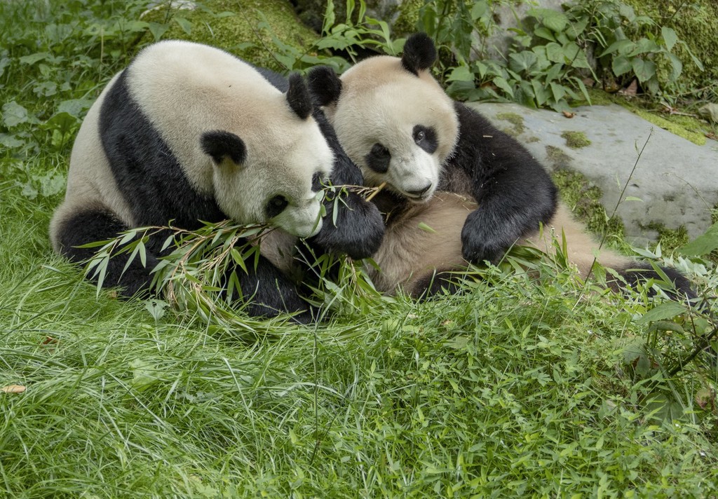 2022年8月11日,四川省阿坝州汶川县中国大熊猫保护研究中心核桃坪基地,大熊猫在享用美食,嬉戏玩耍,生活悠闲幸福。