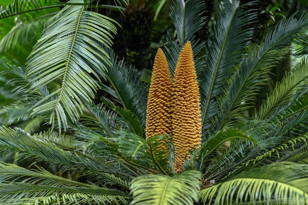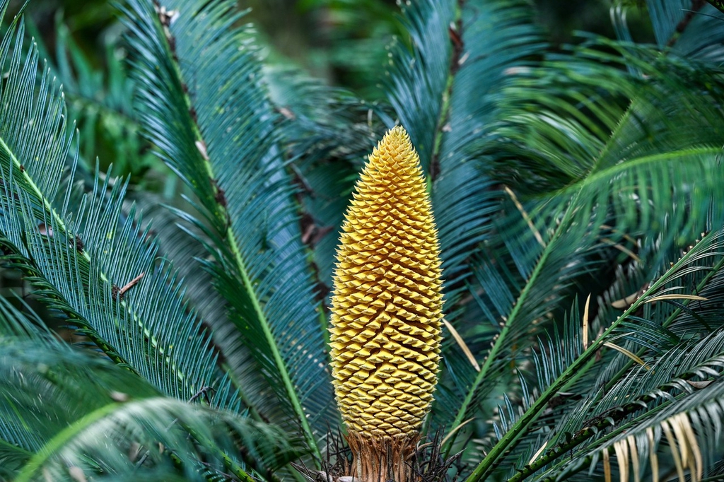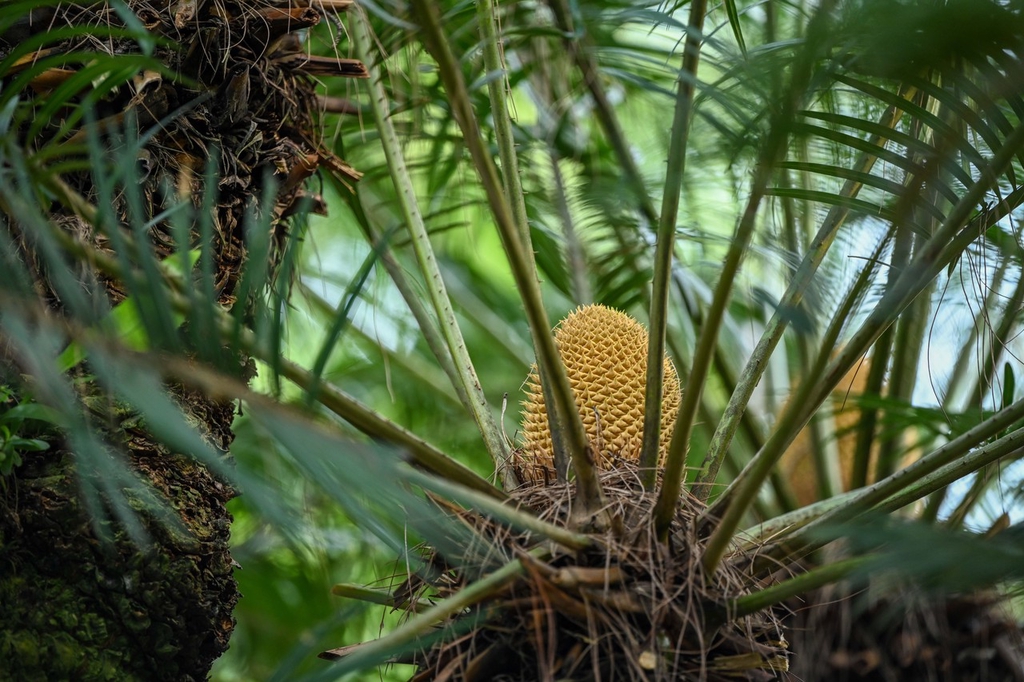 2023年5月25日,广西南宁,青秀山苏铁园里上万株铁树开花,成为一道亮丽的“铁树开花”景观。金黄的“宝塔”立在茎叶间,这是雄花;黄色的“绣球”尽情绽放,这是雌花。在南宁青秀山这座占地80亩的苏铁园中,最著名的是一株高大挺拔的千年苏铁王,这株千年铁树年年开花,成为苏铁园里的一道奇特景观。它高7.8米,树围最粗处3.8米,胸径0.95米,冠幅5.15米。经测算,“苏铁王”至今已有1360多岁了。据悉,这株苏铁是中国现有记载树龄最古老的苏铁,因此被称为“苏铁王”。南宁市青秀山苏铁园里的铁树绿油油的茎叶间,有不同形态的黄色花朵绽放。有的如宝塔矗立,又形似玉米棒子,长约40厘米;有的像绣球,开着球状花,花瓣则像鸡的爪子。由于铁树本身是热带地区的植物,它在北方因为积温和光照条件不符合,所以很难开花。但在南方,成年铁树(树龄十几年以上)如果养护得当,几乎每年都会开花。苏铁的花期在每年5月到8月。苏铁还有一种相当有趣的特性,人分男女,树分公母,苏铁的雌雄只有等它开花之后,才能分辨得出来。雌花是半球形的,像卷心菜;雄花是圆柱形的,如同一个玉米棒。(未经许可,请勿转载)