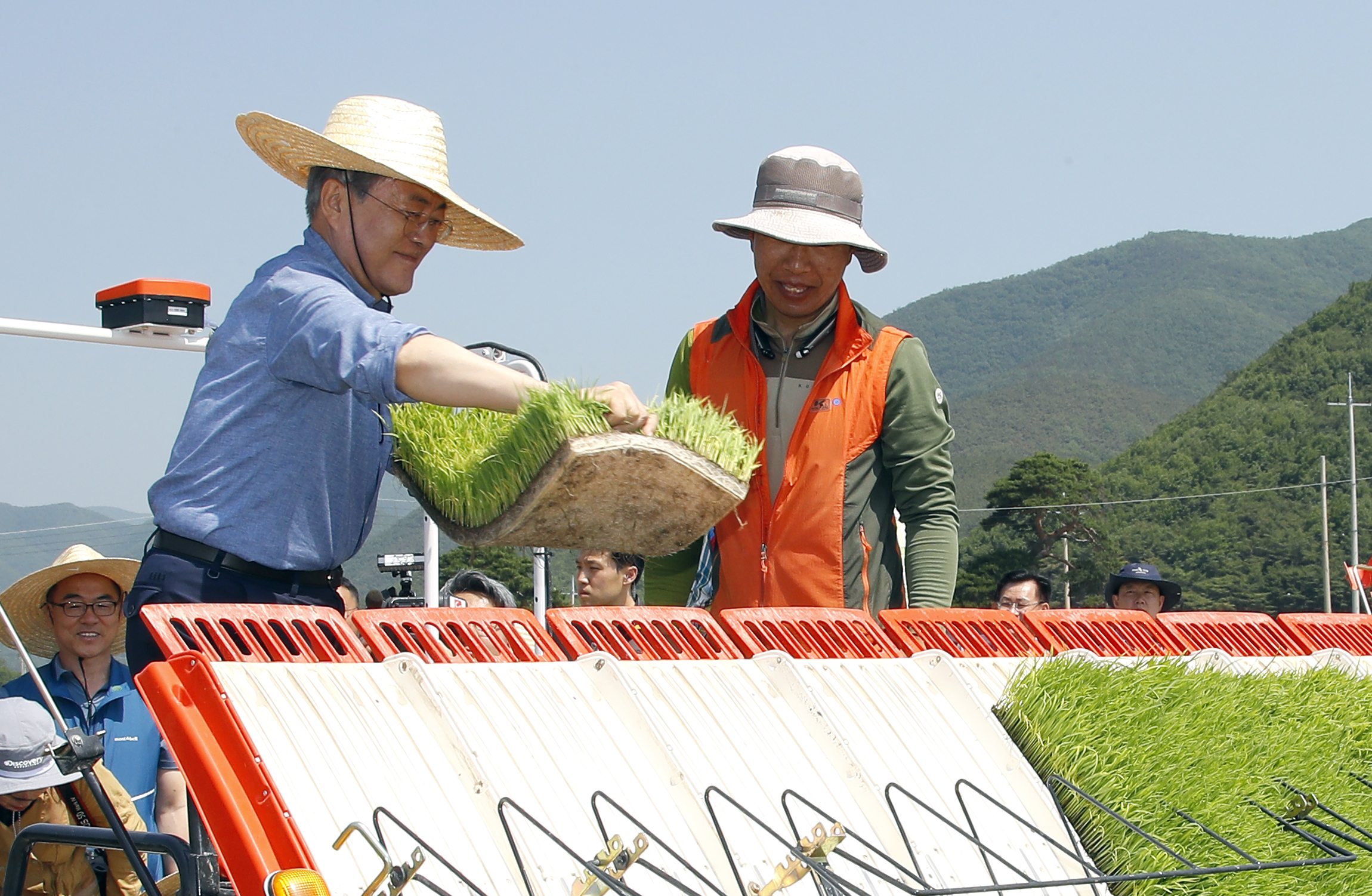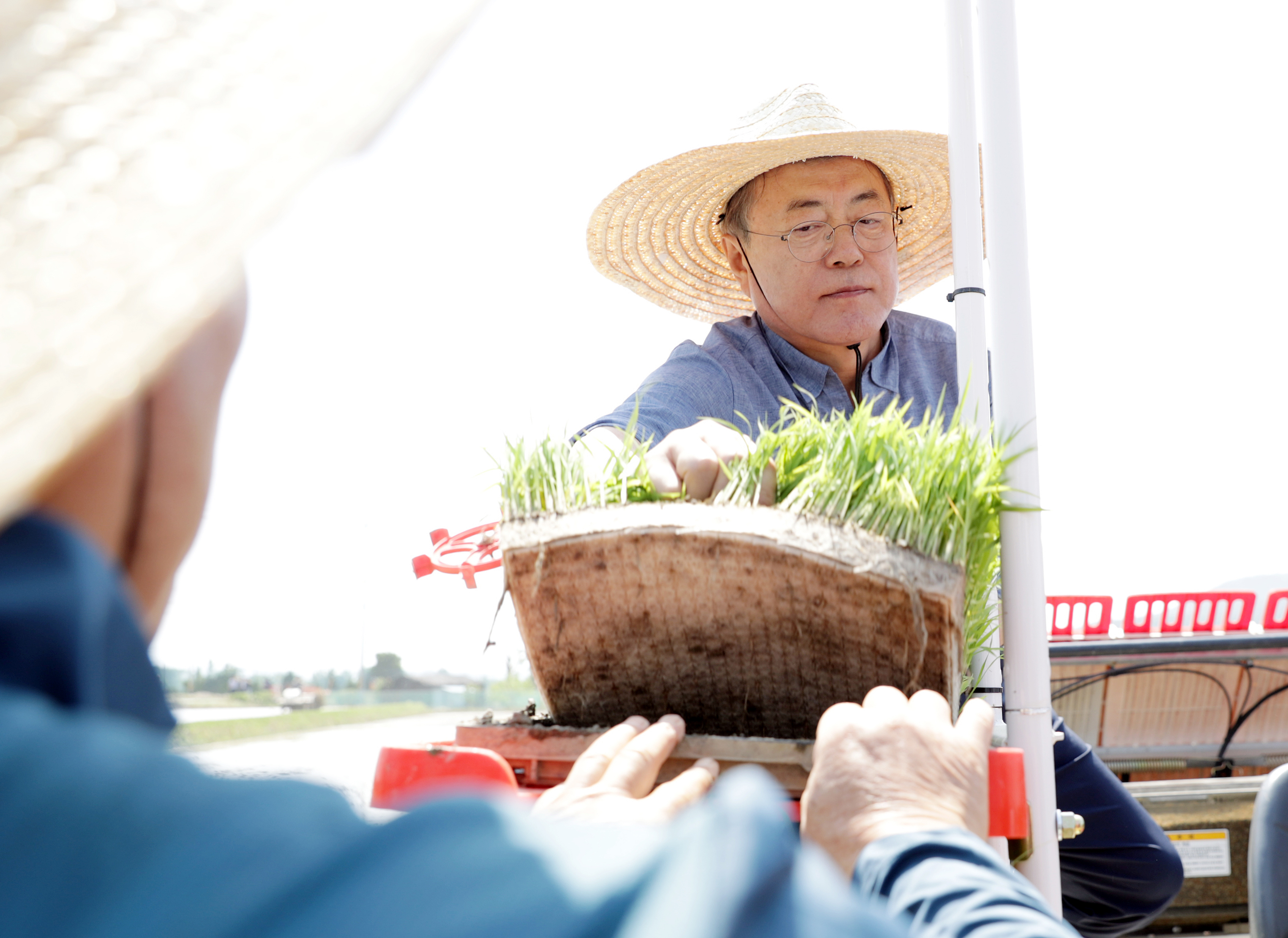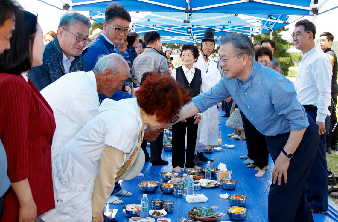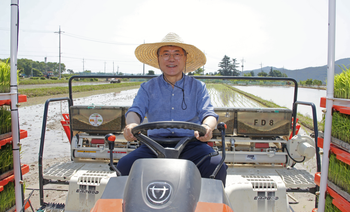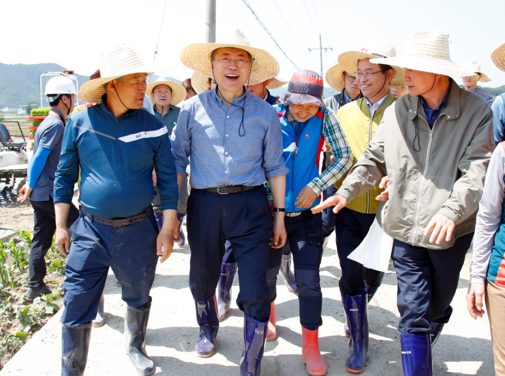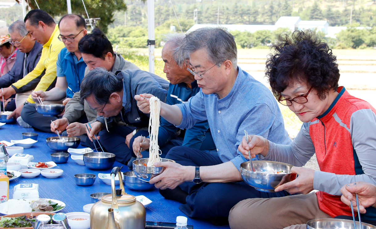 当地时间2019年5月5月24日,韩国庆尚北道庆州市玉山村,韩国总统文在寅赴当地视察,与农民们一道插秧,并同村民露天吃午饭,亲和力十足。