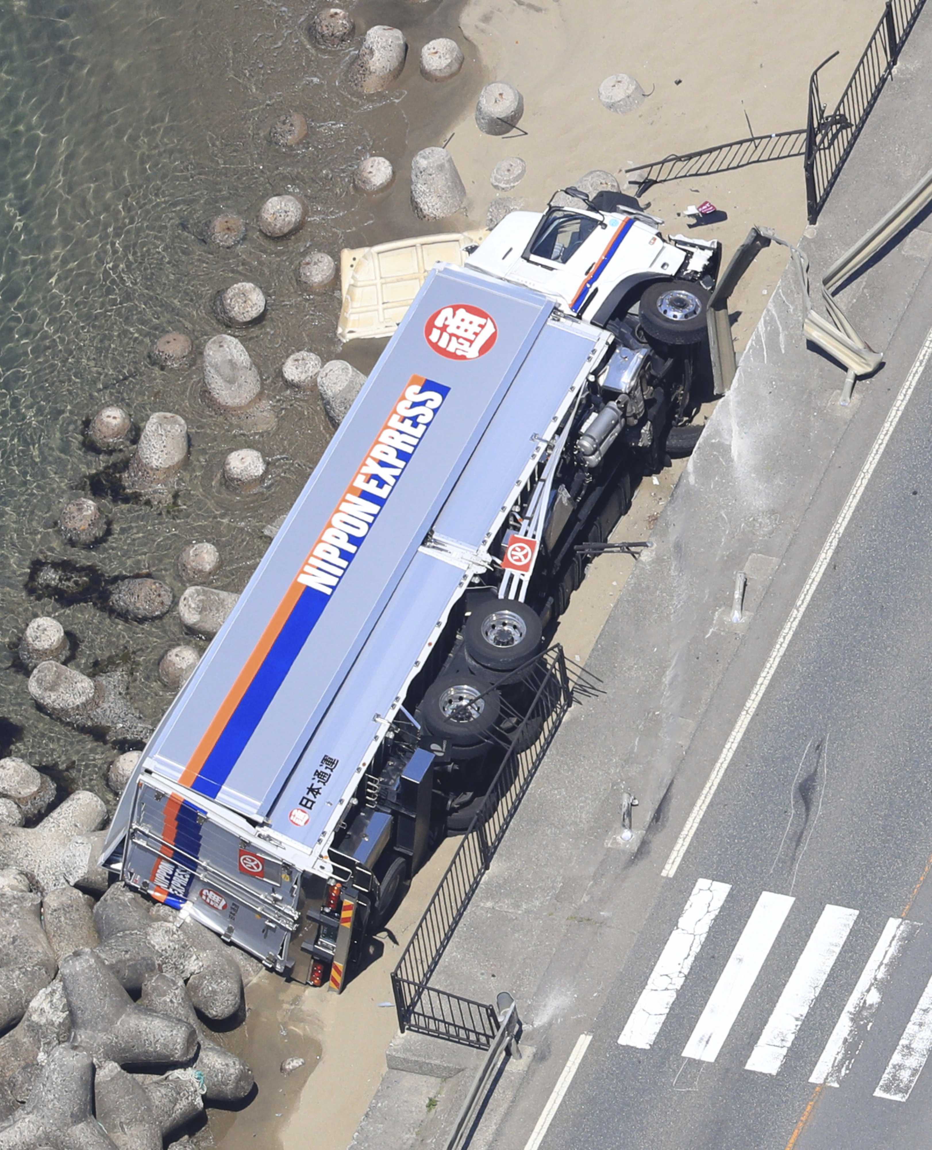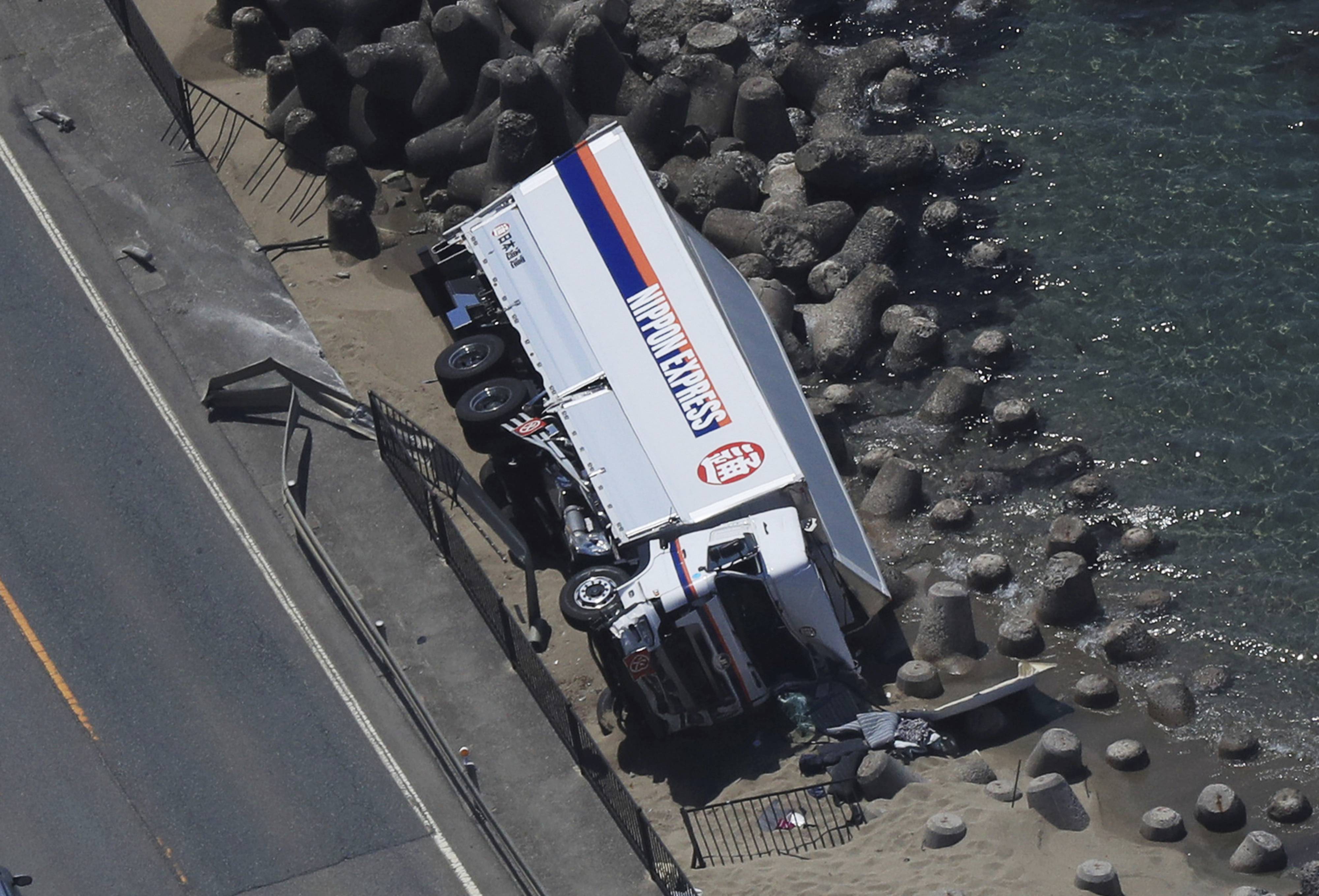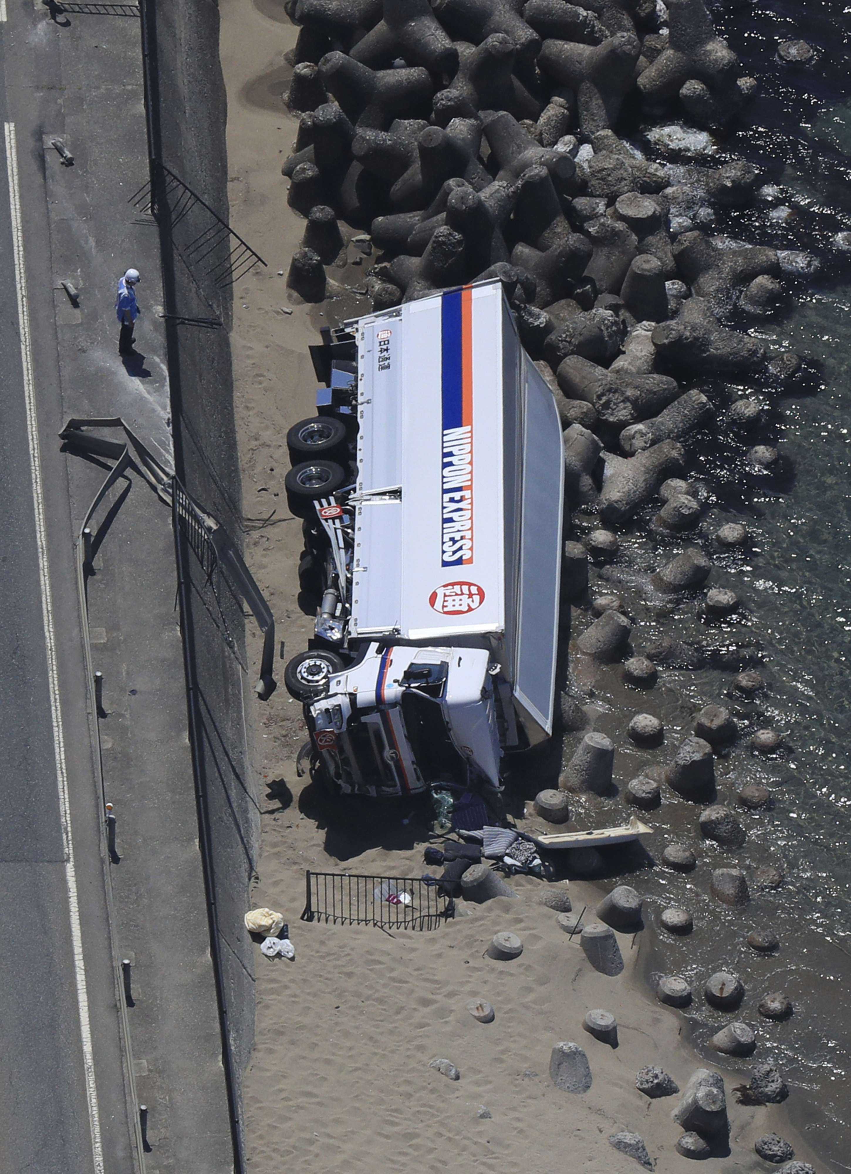 当地时间2019年5月25日,日本山形县鹤冈市,25日上午,日本山形县发生一起交通事故。一辆载有10吨炮弹的货车滚落下5米高的桥,所幸未爆炸。