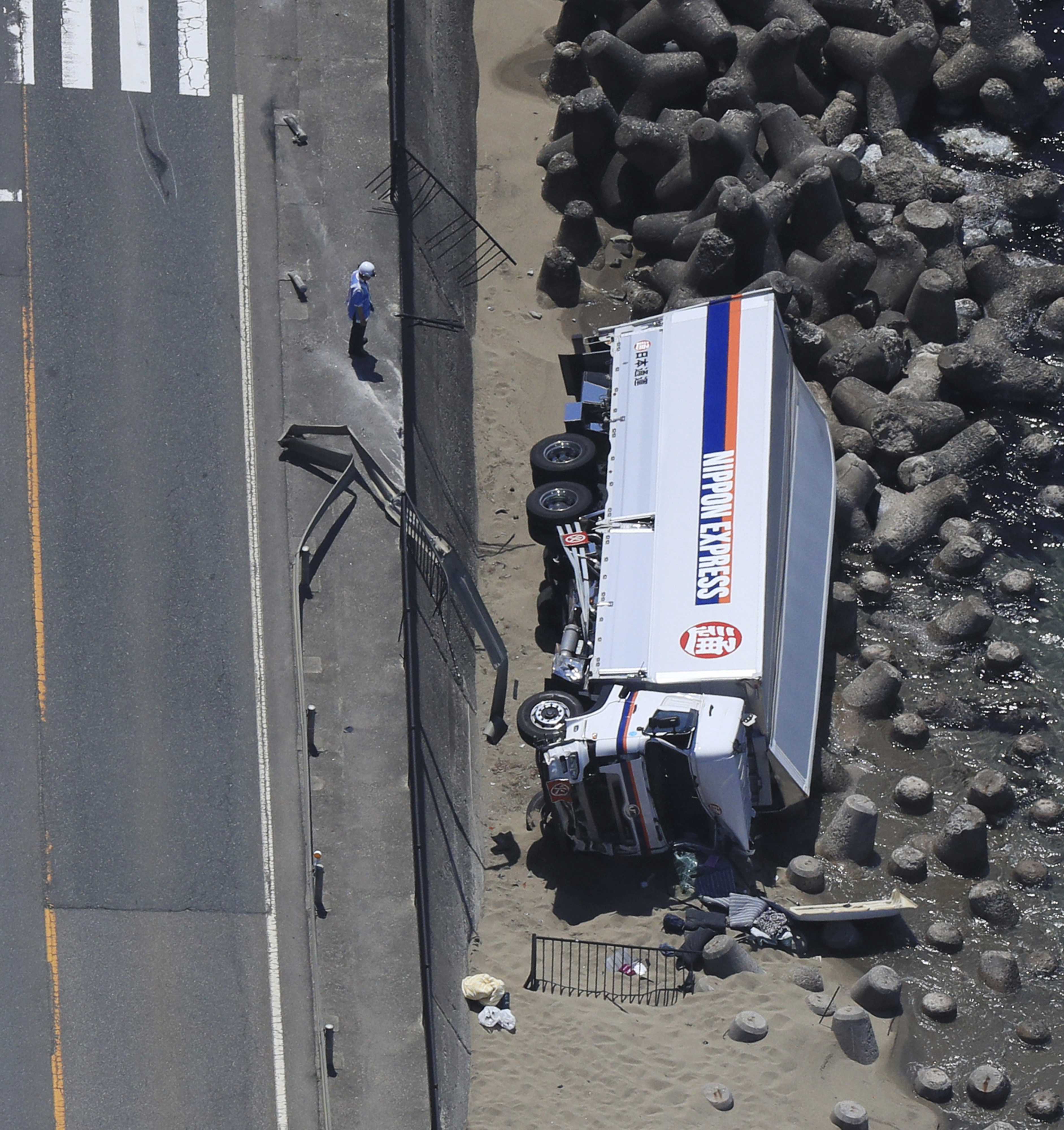 载10吨日本自卫队炮弹货车与轿车相撞 从5米高桥上滚落