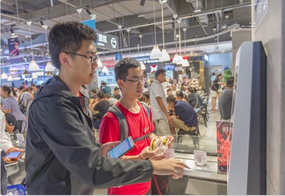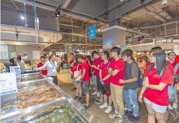 “小龙虾咸蛋肉夹馍?跟肉夹馍有什么区别“、”如果促销,这个要怎么改价钱?”、“3公里买瓶水也免费送货吗?”同学们一到门店就提出了各种问题。“我们盒马是通过技术驱动,为门店周边3公里的居民带来最快30分钟免费送达的体验。在一家门店内容,融合了超市、餐饮、电商以及物流中心,四位一体的经营模式让我们的坪效可以做到传统零售的3-5倍”。盒马鲜生西安大都荟店店长张哲为学生们耐心解答。