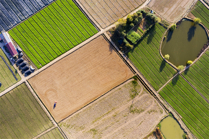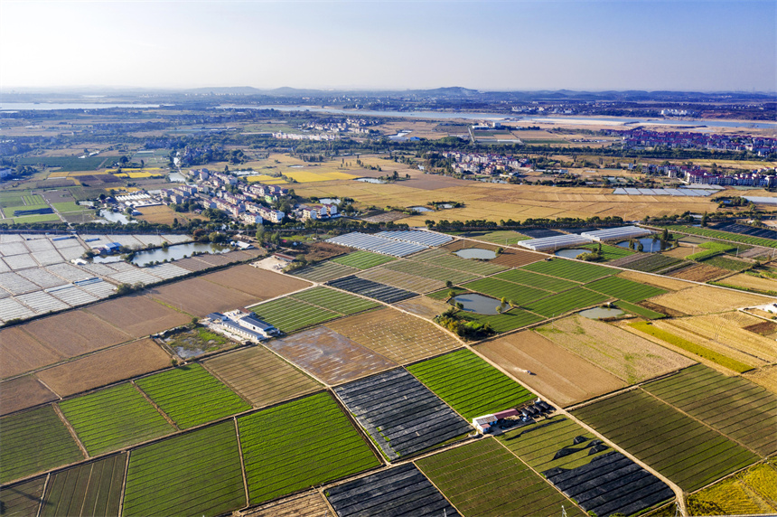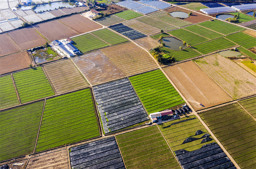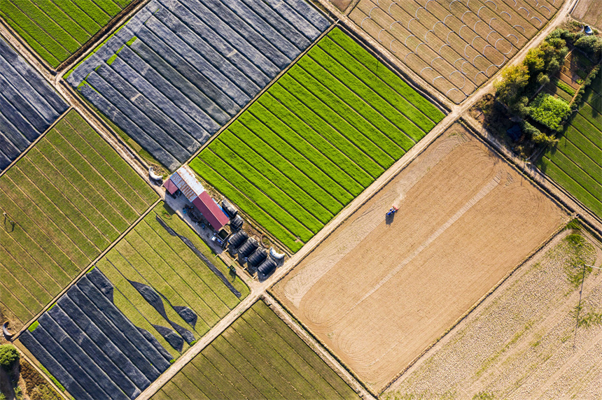 近日,晴空万里,从高空俯瞰江西省丰城市小港镇路口村黎蒿种植基地,景色美不胜收。初冬时节,小港镇路口村一块块排列整齐、色彩斑斓的田地,宛如大自然的“调色板”,勾勒出一幅乡村振兴的美丽画卷。(罗娜、周亮)