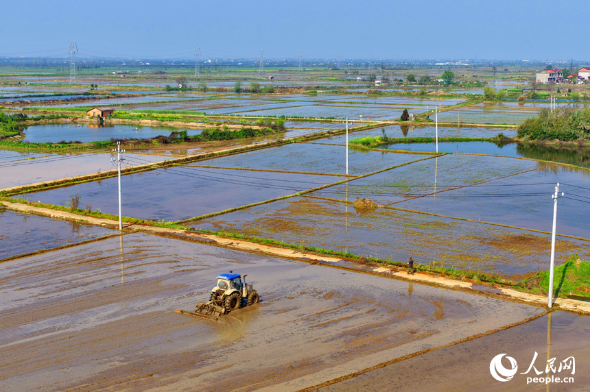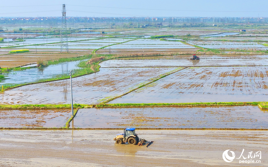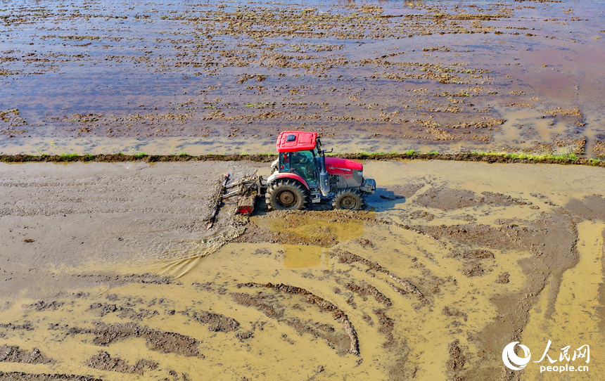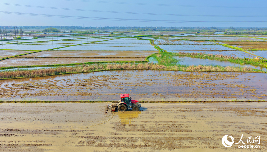 人民网南昌4月4日电 (记者朱海鹏)江西省南昌市南昌县蒋巷镇五丰村,村民驾驶大型拖拉机在犁田、打浆。田间地头,农机往来作业,机声隆隆,一派繁忙景象。今年,南昌县各地抢抓农时开展春耕,县里加大对新型农业机械的推广力度,组织技术人员进村入户指导,确保春耕生产顺利推进。