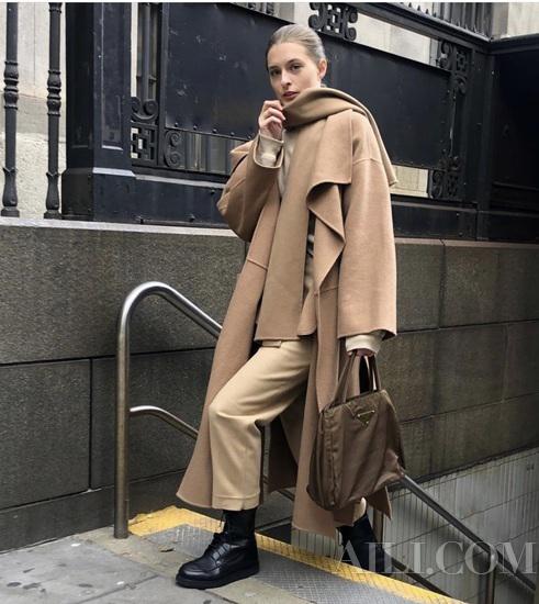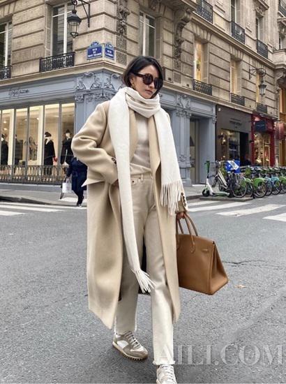 想要将燕麦色的高级感放大,不妨试试一整身燕麦色单品,不一定非要是完全相同的一身色彩,在同色系里搭出深浅的层次感,才能彰显你的搭配功力。大衣围巾和长裤是同色系单品,但却在色彩上有轻微的差别,很能突出搭配的表现力。
