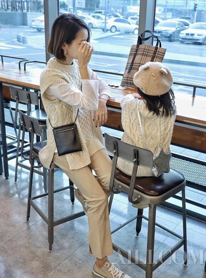 或者选择一条燕麦色长裤,上衣选择舒适的白色打底和宽阔的针织本心,如此基础款的单品很适合和女儿组成温馨的亲子装。
