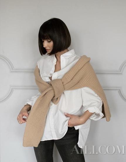 一件燕麦色单品很适合与白色单品组成天生一对,黄皮女生担心燕麦色不显白,也可以用白色做过渡,塑造温柔的造型。一件白衬衫搭配一件燕麦色毛衣就很适合现在的天气,室内温度升高把毛衣系在尖头更是当下博主们最爱的热门穿法。