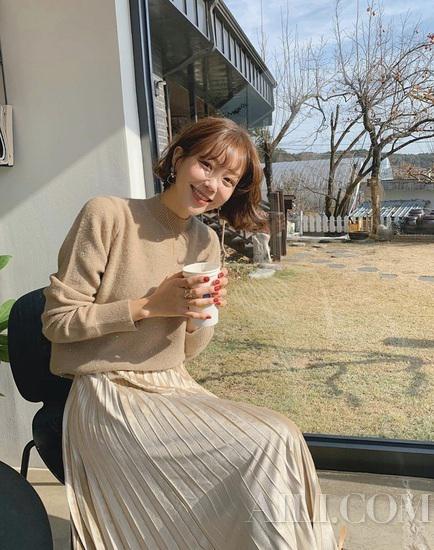 一件温柔的燕麦色毛衣搭配带有反光材质的燕麦色长裙,一浓一淡,既是对比也是过渡。
