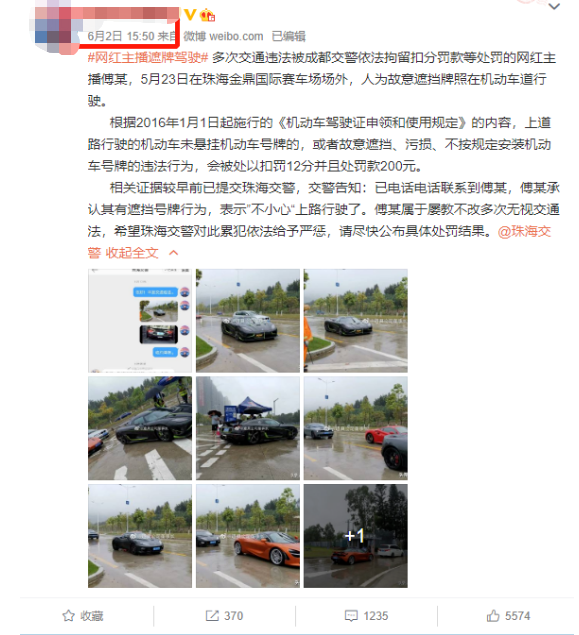 昨天(6月2日)下午,有网友在新浪微博发帖子举报:“一辆柯尼塞格超跑5月23日在珠海金鼎国际赛车场场外,人为故意遮挡牌照在机动车道行驶。”▼