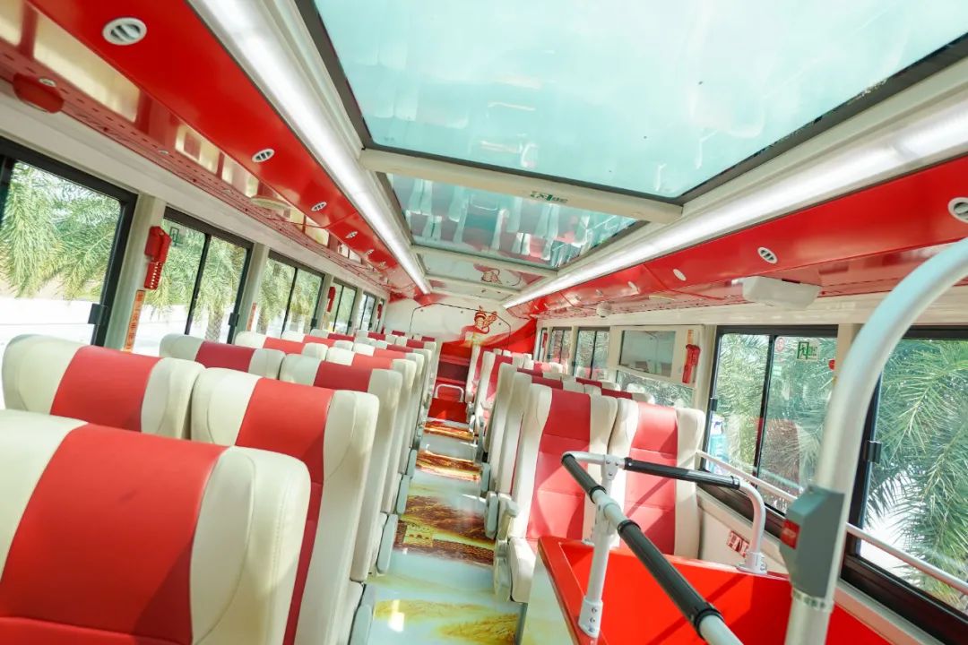 以红色为主色调,将爱国主义元素融入其中,坐在车厢内,赏窗外美景,令人不禁心潮澎湃。