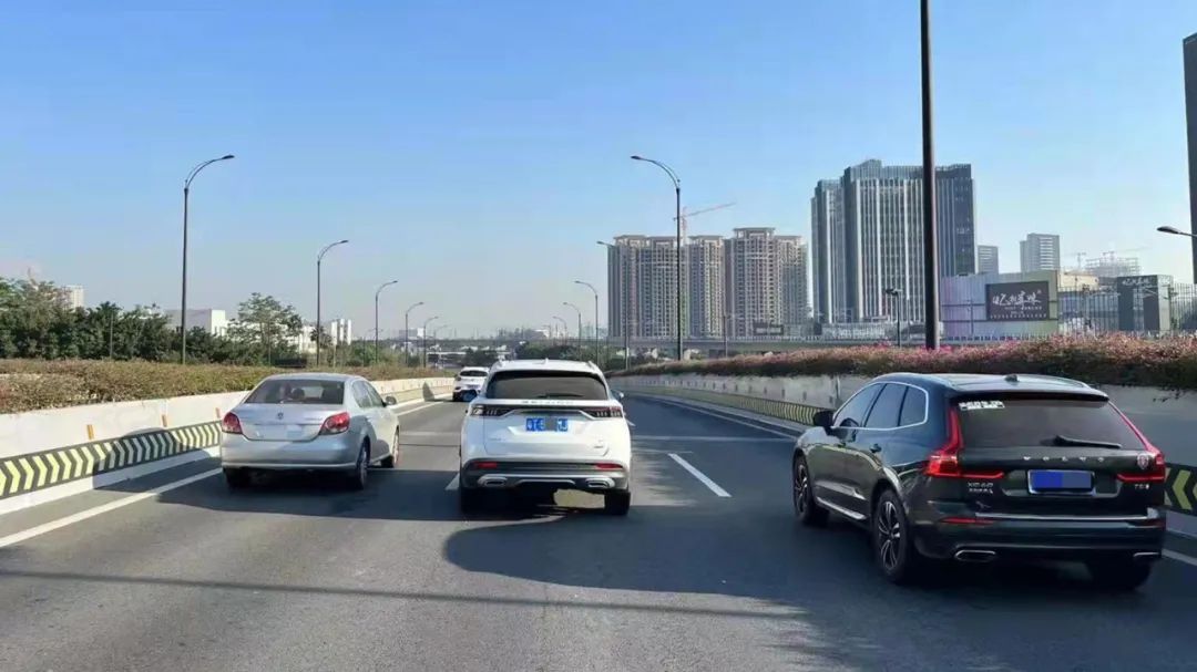 金唐交警大队辅警小陈正巡逻到金凤路上,见到车流积压赶紧上前疏导。这时他却发现一辆粤T5××MJ号白色小汽车停在立交桥顶中间车道。▼