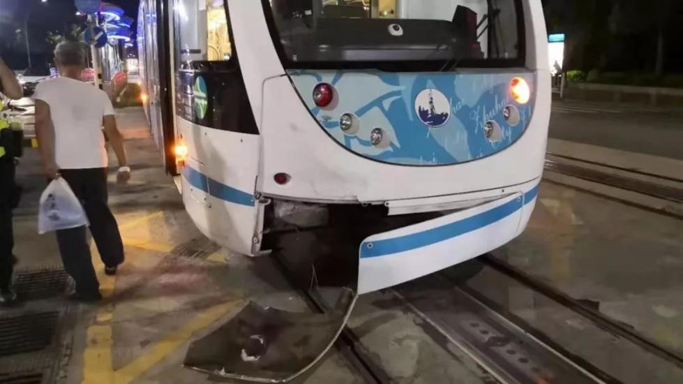 接报后,香洲交警张警官迅速赶往现场。一辆有轨电车打着双闪灯停在中大五院路口,有轨电车车头右侧盖板撞烂,车内零件爆出,车身也有多处刮痕;