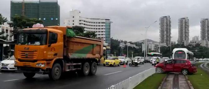 今年6月17日下午4点,一辆红色飞度小车沿梅华路东往西方向行驶,司机王某光顾着看前方车况,向左变道时没注意到左边的泥头车。泥头车刹车不及撞飞飞度小车,飞度旋转360度后,铲上了轨道上才停了下来。