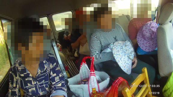 司机一边打开后座车门,一边低声跟周警官说:“我载人去工作的”。随着车门一开,一位阿姨从车上下来,身后的场景惊呆了交警!驾驶位旁放了两个小板凳,驾驶位后面密密麻麻坐满了上年纪的叔叔阿姨,都探出头瞅着周警官。除了原有的6个乘客座位,尾部还加了两排硬座,面对面并排坐了6个人,过道上还放了好几把锄头和几袋行李,一丝间隙都不放过。▼