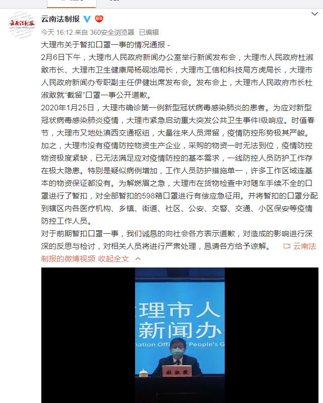 大理市“截留”598箱口罩,市长公开道歉:恳请谅解