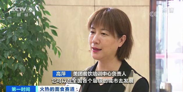 美团餐饮培训中心负责人 高萍: 很少有一个品类,它可以在全国各个层级的城市去发展,也就是说,粉面类的发展,它不会受到地域限制;第二点,它是特别容易标准化的一个品类,我们认为粉面类的单品的门店类,未来的规模趋势是比较大的。