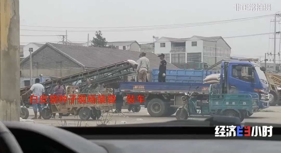 记者在泗县瓦坊镇调查时,就偶然看到一户村民,用小货车买了十几袋白皮袋种子。这些种子和洋湖原种场售卖的类似,同样没有品牌、品种等标签,包装袋上一片纯白。