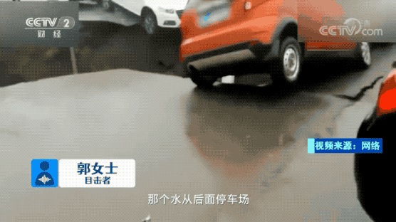 目击者 郭女士: 平常停车场车挺多的。面积挺大的。公安科的人过来了,让车有序撤离,好多车已经掉下去了,那旁边可以看到那个坑,还有车在那悬挂着,肯定要掉下去了。水已经把坑填满了,水从后面停车场已经往居民家里漫了,现在我们已经撤离了。
