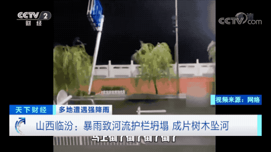 近日,山西临汾安泽县连续多日遭遇暴雨,导致河流护栏坍塌,现场有目击者拍摄的视频画面显示,路旁成片的树木和路灯坠入河中 。
