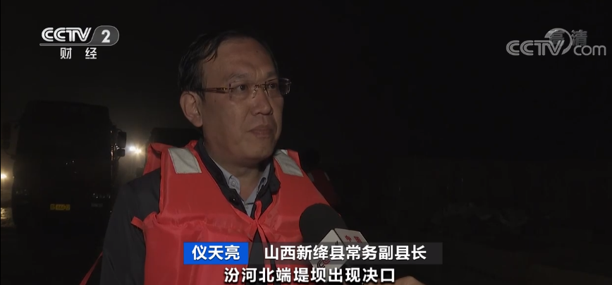 山西新绛县常务副县长 仪天亮: 汾河北端堤坝出现决口,险情发生以后,我们立即制定方案,全力进行抢险。一是组织水利工程专家进行精准举措,二是调集各种抢险机械和车辆100余台、各类抢险物资5000余份,三是调集300余人专业抢险队伍,进行坝体集中加固。