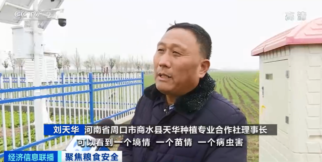 河南省周口市商水县天华种植专业合作社理事长 刘天华: 在任何地方打开手机,可以看到墒情、苗情、病虫害,管理上更精准、更有效。通过高标准农田的打造,智能化的运用,比以前能节水45%。
