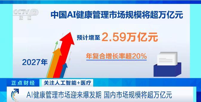 专业机构预计,中国AI健康管理市场规模将超万亿元,2027年预计增至2.59万亿元,年复合增长率超20%。