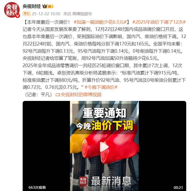 记者今天从国家发展改革委了解到,12月22日24时国内成品油调价窗口开启,这也是本年度最后一次调价,受到国际油价下调影响,国内汽、柴油价格将下调。12月22日24时起,国内汽、柴油价格每吨分别下调170元和165元。全国平均来看:92号汽油每升下调0.13元,95号汽油每升下调0.14元,0号柴油每升下调0.14元。央视财经记者给您算了笔账,用92号汽油加满50升油箱将少花6.5元。