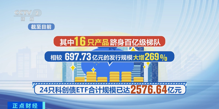 细分品类同样亮眼,2025年7月和9月两批科创债ETF先后上市,市场热度持续攀升。截至目前,24只科创债ETF合计规模已达2576.64亿元,相较697.73亿元的发行规模大增269%,其中16只产品跻身百亿级梯队。