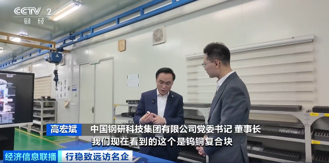中国钢研科技集团有限公司党委书记 董事长 高宏斌:钨铜复合块在短时的热量输入密度,高于火箭的发动机喷口。超低温钢在核聚变装置中的工作温度是零下269℃,通常的材料都会变得脆,超低温钢能够在零下269℃的工作环境下保持强度,形象地说就是我们指甲盖大小的面积的承重,要达到15头大象的重量。
