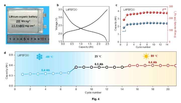 基于此材料,团队制备出一款能量密度超过250瓦时/公斤的有机软包电池,这一数值已超越目前广泛使用的磷酸铁锂电池。这款电池展现出卓越的温度适应能力,不仅能在-70℃到80℃的温度下正常工作,还兼具良好的柔韧性与安全性。