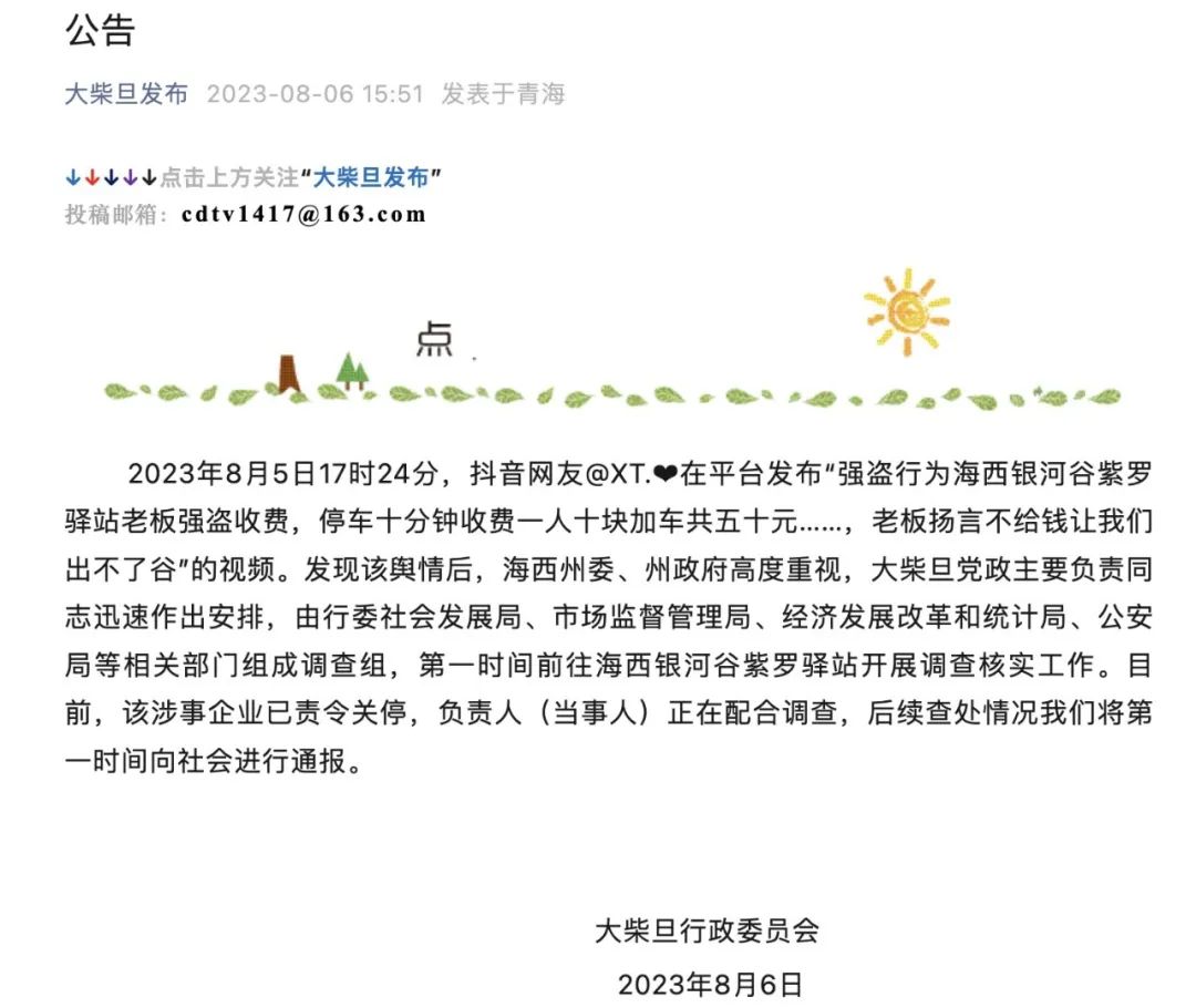 经核实,涉事企业为大柴旦银河谷紫罗驿站,该企业存在违规收取停车费用行为。8月6日,大柴旦行委公安局对涉事企业当事人进行警示教育,随即当事人公开发布致歉视频。依据《中华人民共和国价格法》第三十九条之规定,大柴旦行委市场监督管理局依法没收该企业违法所得,处以违法所得5倍的罚款,并作出停业整顿60日的行政处罚。