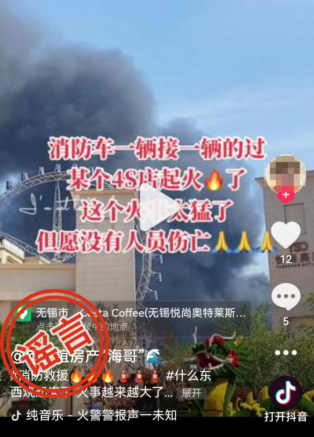 目前网上流传的“无锡悦尚着火”“某4S店着火”“无锡一家雷克萨斯仓库起火”等内容均为谣言信息。