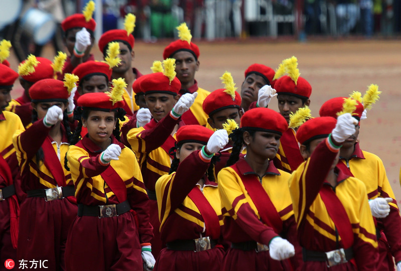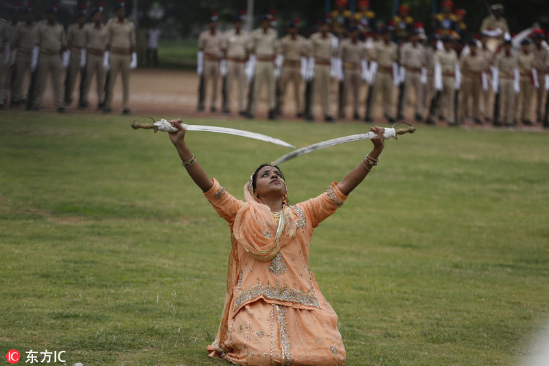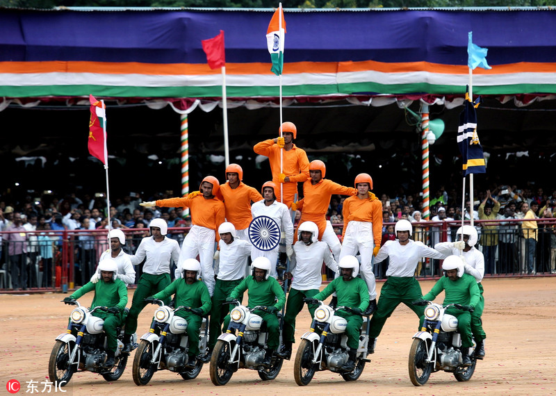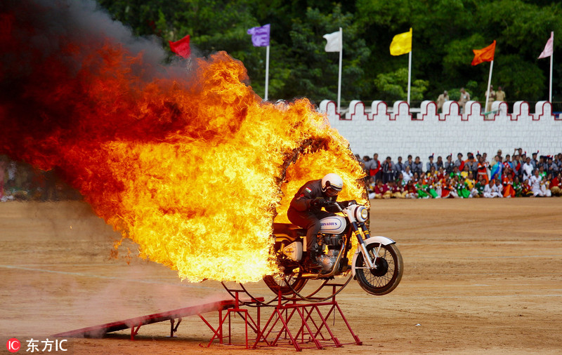 印度多地庆祝独立日 士兵表演飞车钻火圈特技