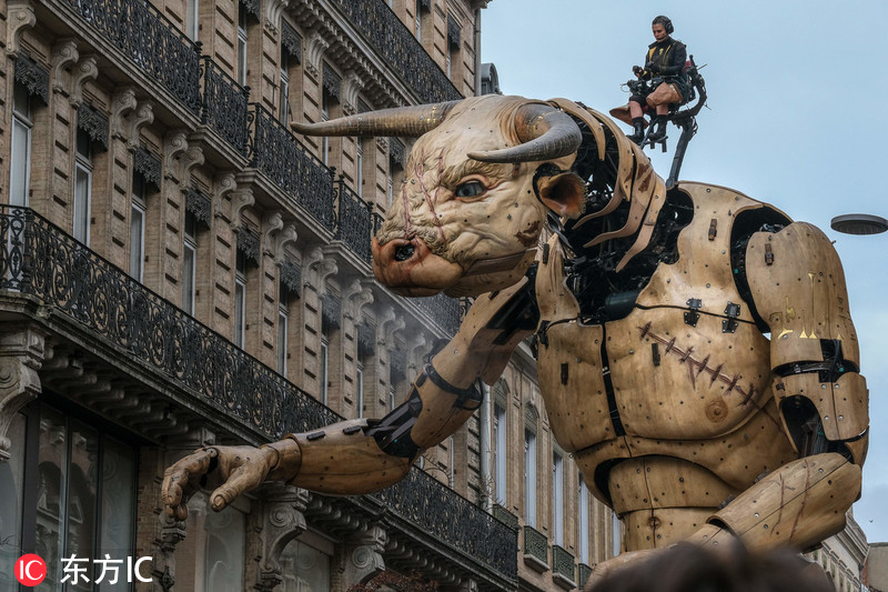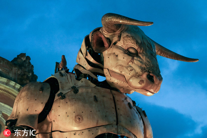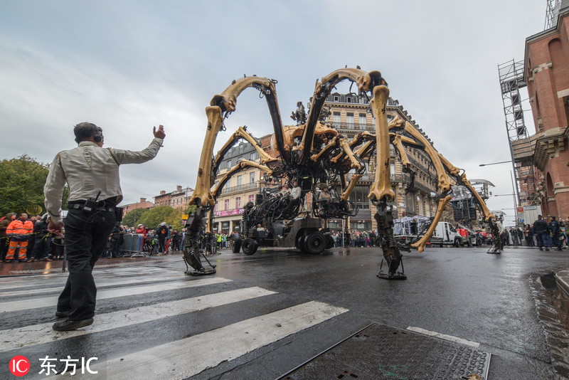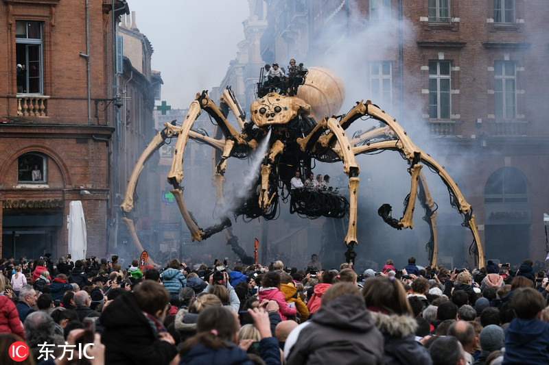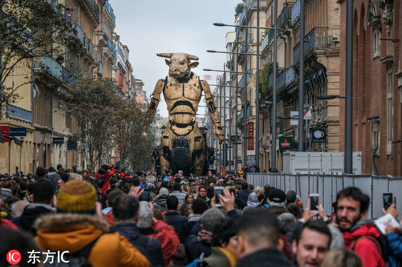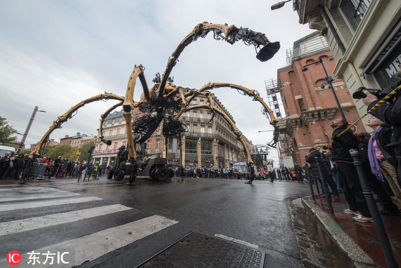 当地时间2018年11月2日,法国图卢兹,法国街头戏剧公司La Machine在当地举办名为“Le Gardien du Temple”的展出表演,半人半牛怪弥诺陶洛斯和蜘蛛机械怪兽亮相,吸引大批民众围观。