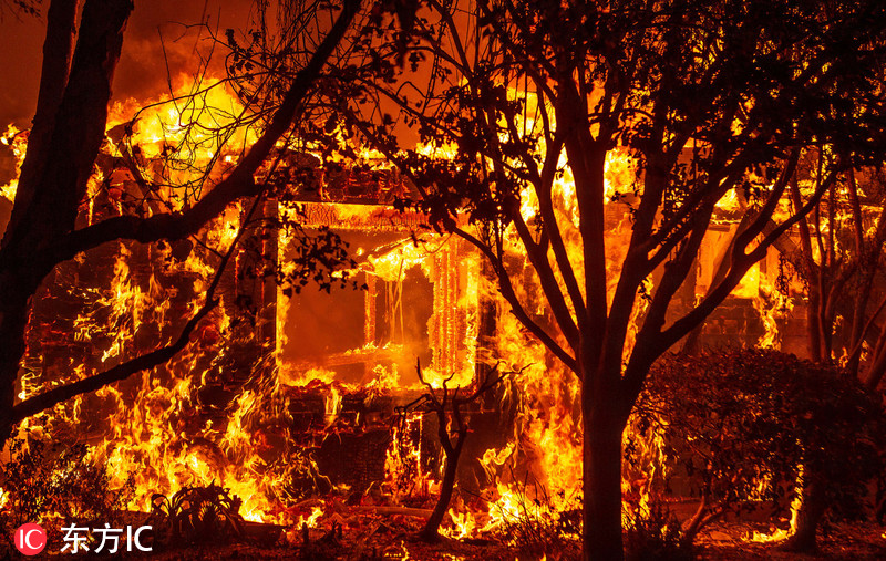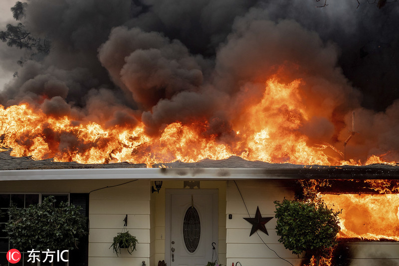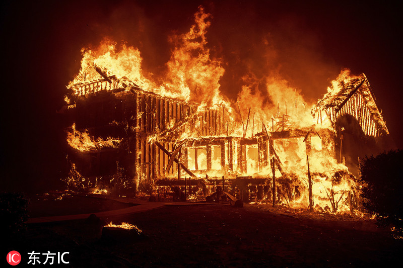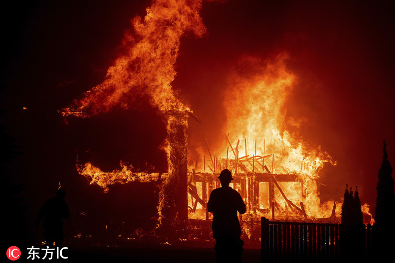 当地时间2018年11月8日,美国加州天堂镇(Paradise),“凯姆普山火”(Camp Fire)火肆虐,当地住宅区陷一片火海。“凯姆普山火”席卷加州北部,当地成千上万的居民被迫撤离。