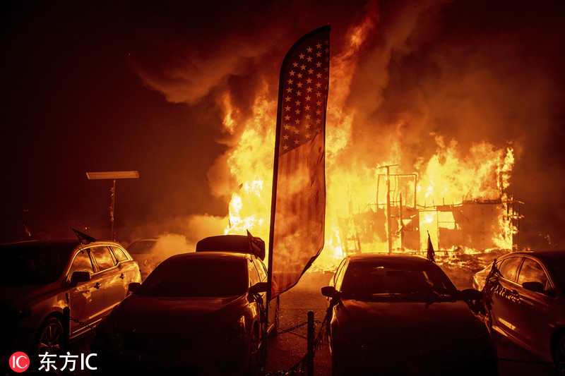 当地时间2018年11月8日,美国加州布尤特县天堂镇(Paradise),“凯姆普山火”(Camp Fire)在当地肆虐,一家汽车经销店被大火吞噬。