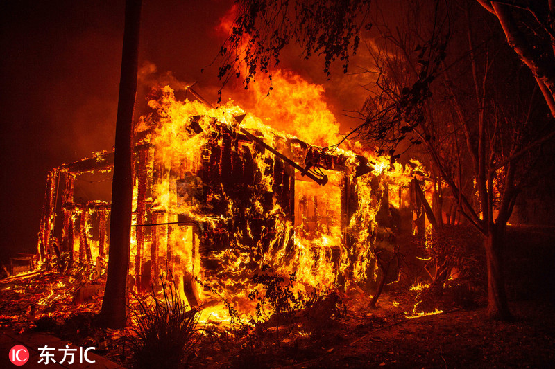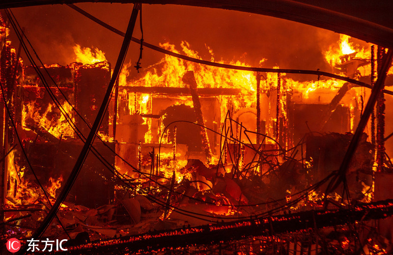 当地时间2018年11月8日,美国加州Paradise,Camp火肆虐,当地住宅区内一片火海。 火席卷加州北部,当地成千上万的居民被迫撤离。