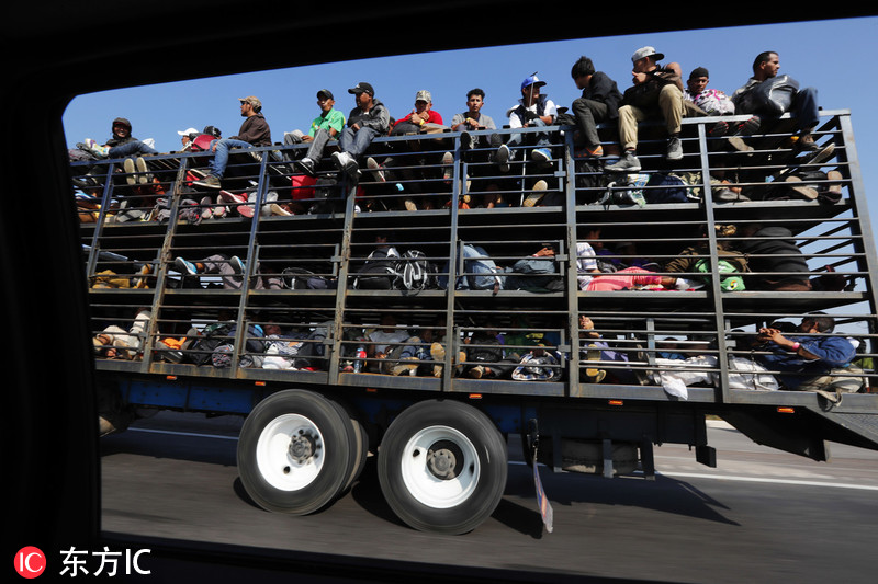 当地时间2018年11月11日,墨西哥塞拉亚,中美洲移民搭乘卡车前往美墨边境。中美洲大篷车移民穿过墨西哥,继续向美国前进。